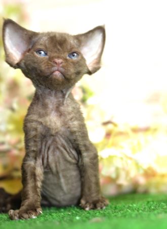 Девочка Devon Rex — шоколадная красавица с огромными ушками “бабочками”.